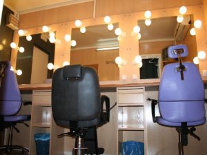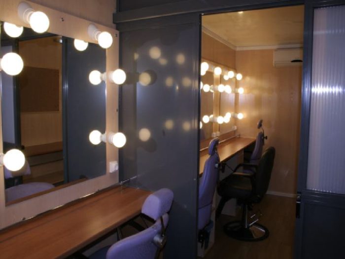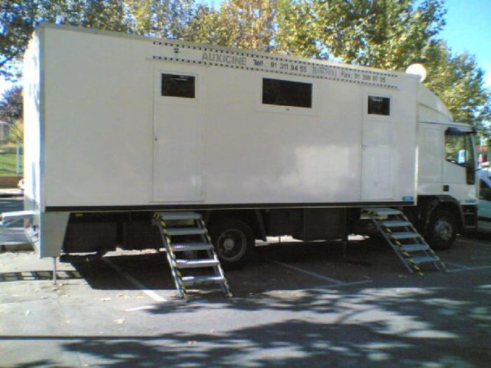 Este camión está equipado con 5 espejos, lavacabezas, aire acondicionado, agua caliente, equipo de música, televisión, nevera, divisoria para vestuario con barras para colgar prendas, WC independiente y grupo electrógeno para abastecer el vehículo.