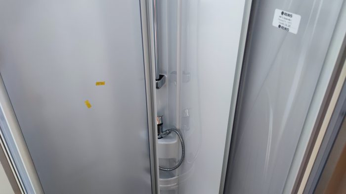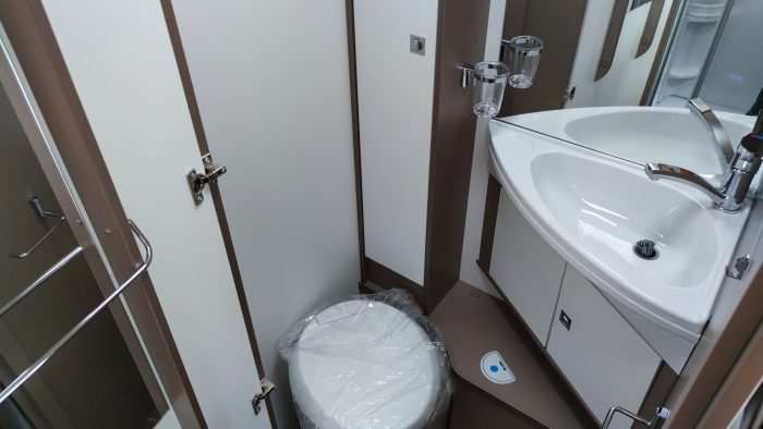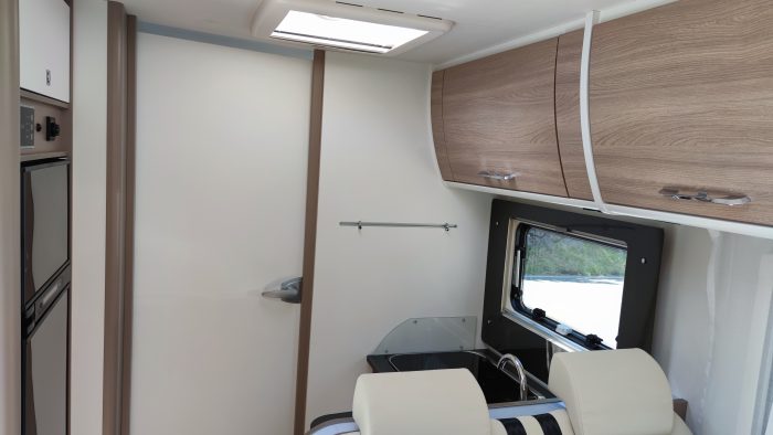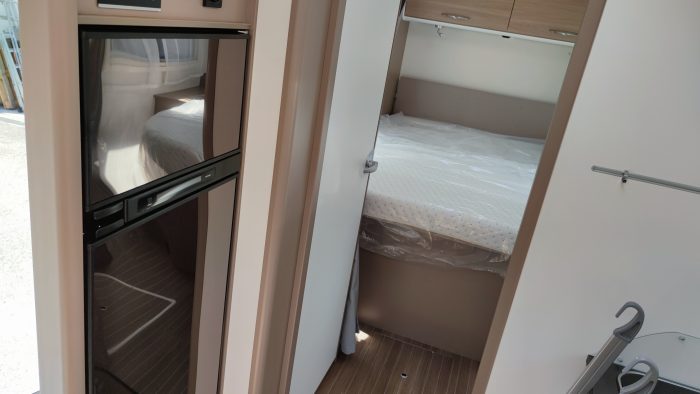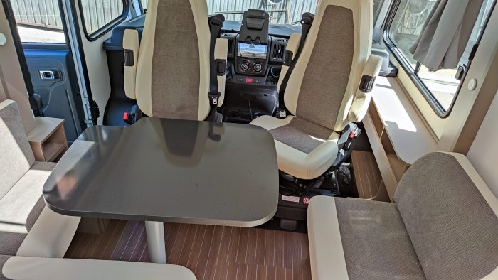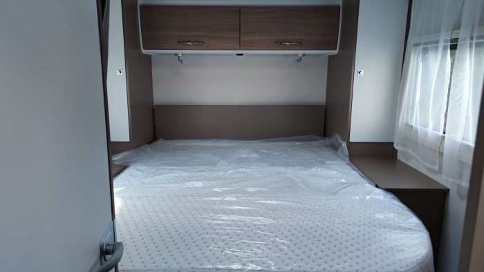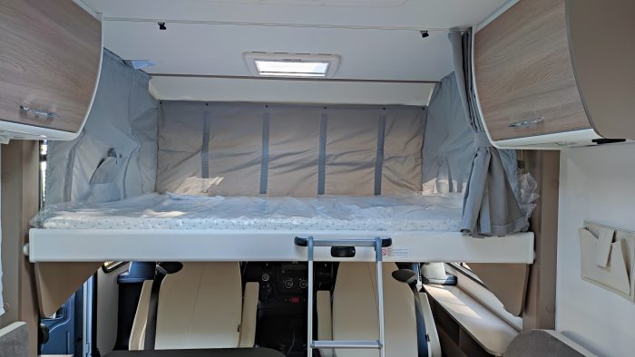 Distribución: cama isla, cama abatible sobe cabina, amplia cocina en L, salón enfrentado girando los asientos de la cabina, baño separado de la ducha y amplio garaje.