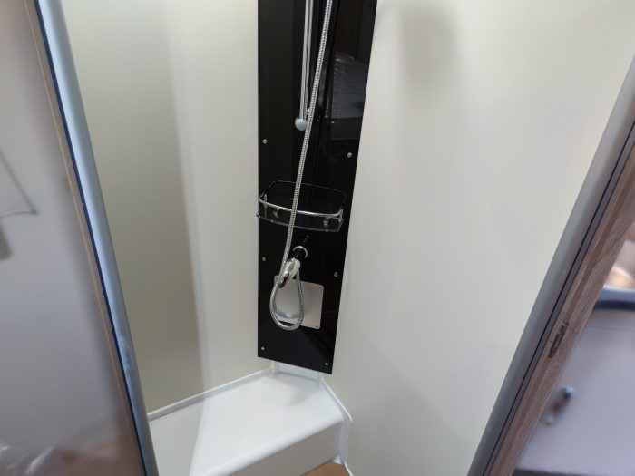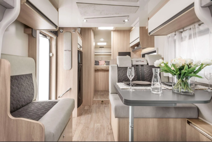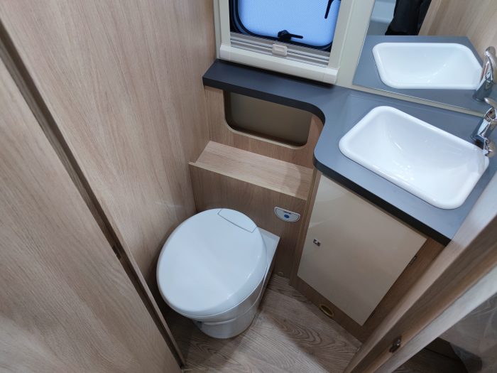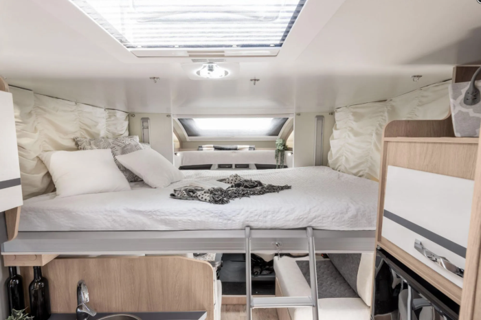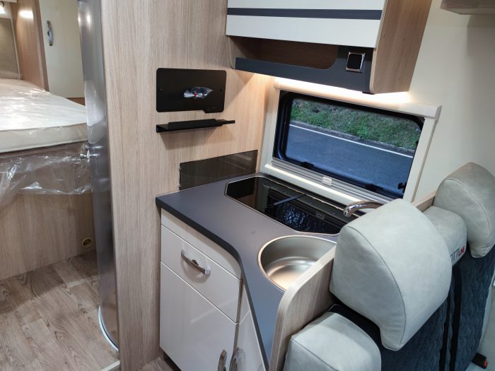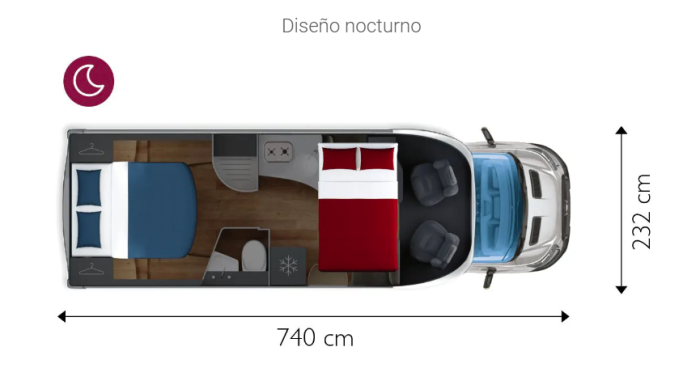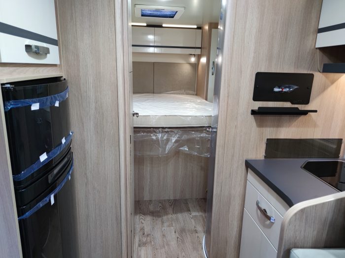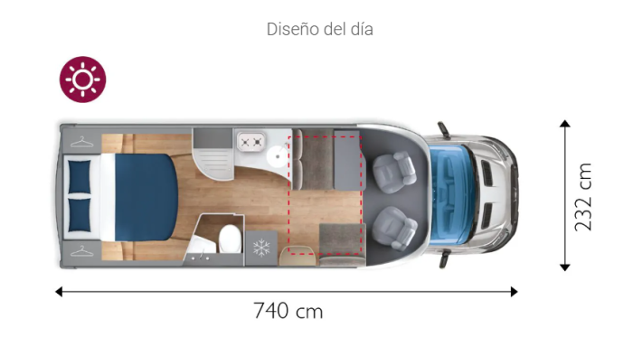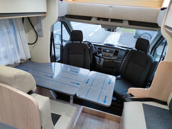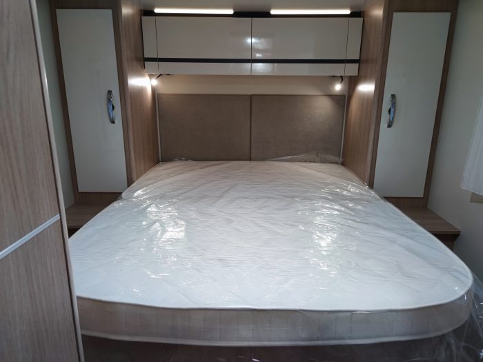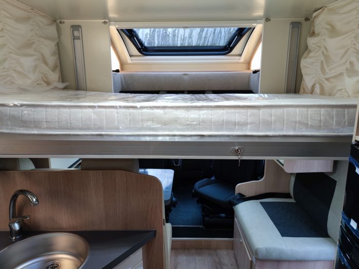Distribución: Cama isla, cama basculante sobre el salón, salón (formado girando asientos de cabina) convertible en cama, amplia cocina, baño separado de la ducha, frigorífico grande con congelador aparte, puerta de separación zona día/noche y gran garaje.