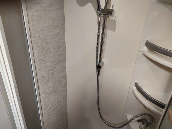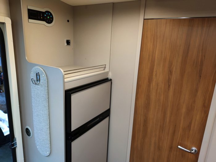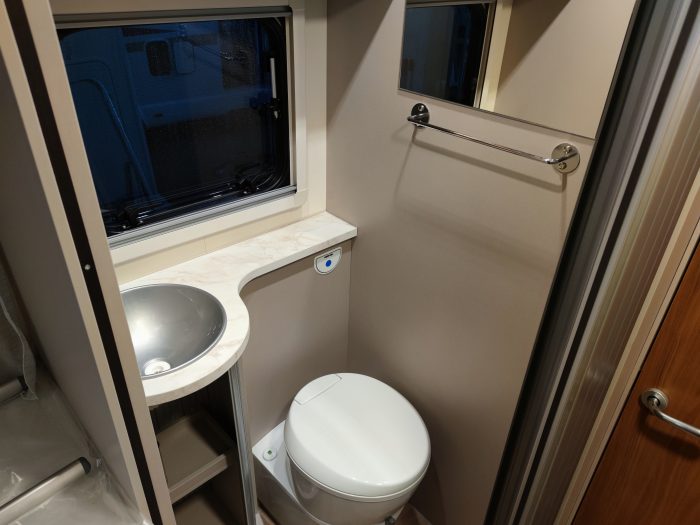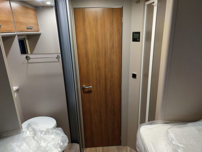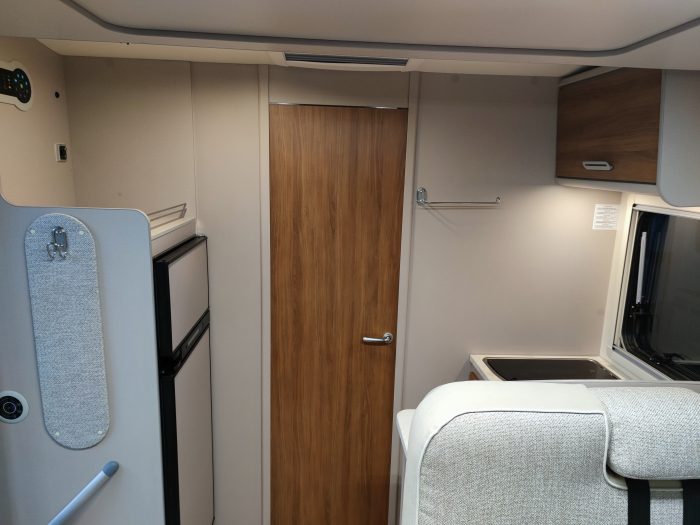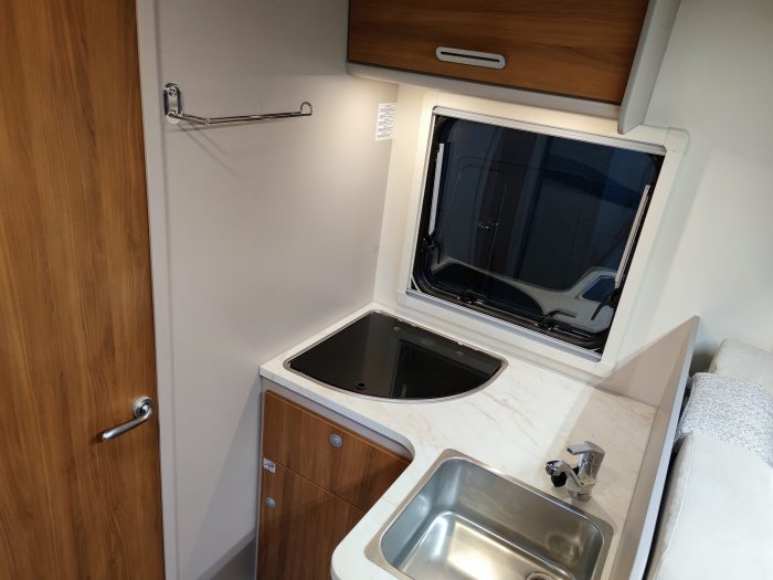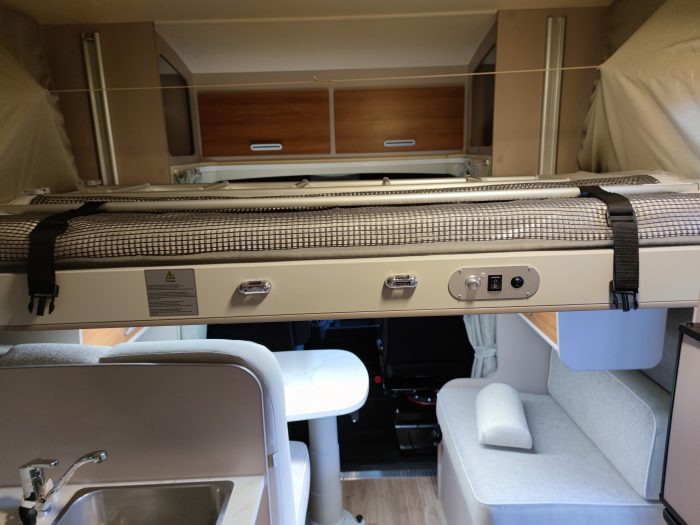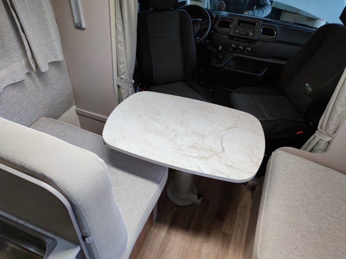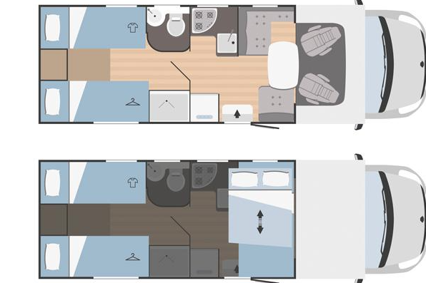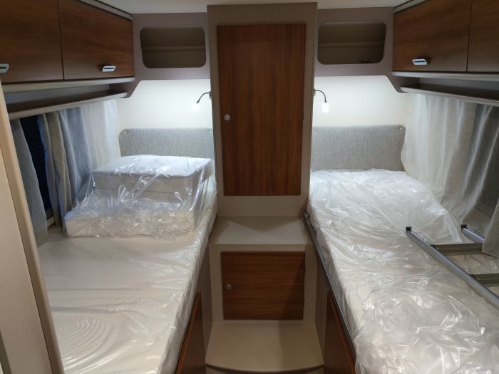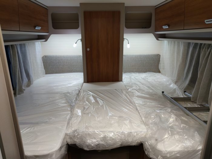 Distribución: autocaravana perfilada con distribución de 2 camas gemelas en la parte trasera, cama abatible sobre el salón, cocina en L, baño separado de la ducha, salón enfrentado girando asientos de cabina y garaje bajo las camas gemelas.